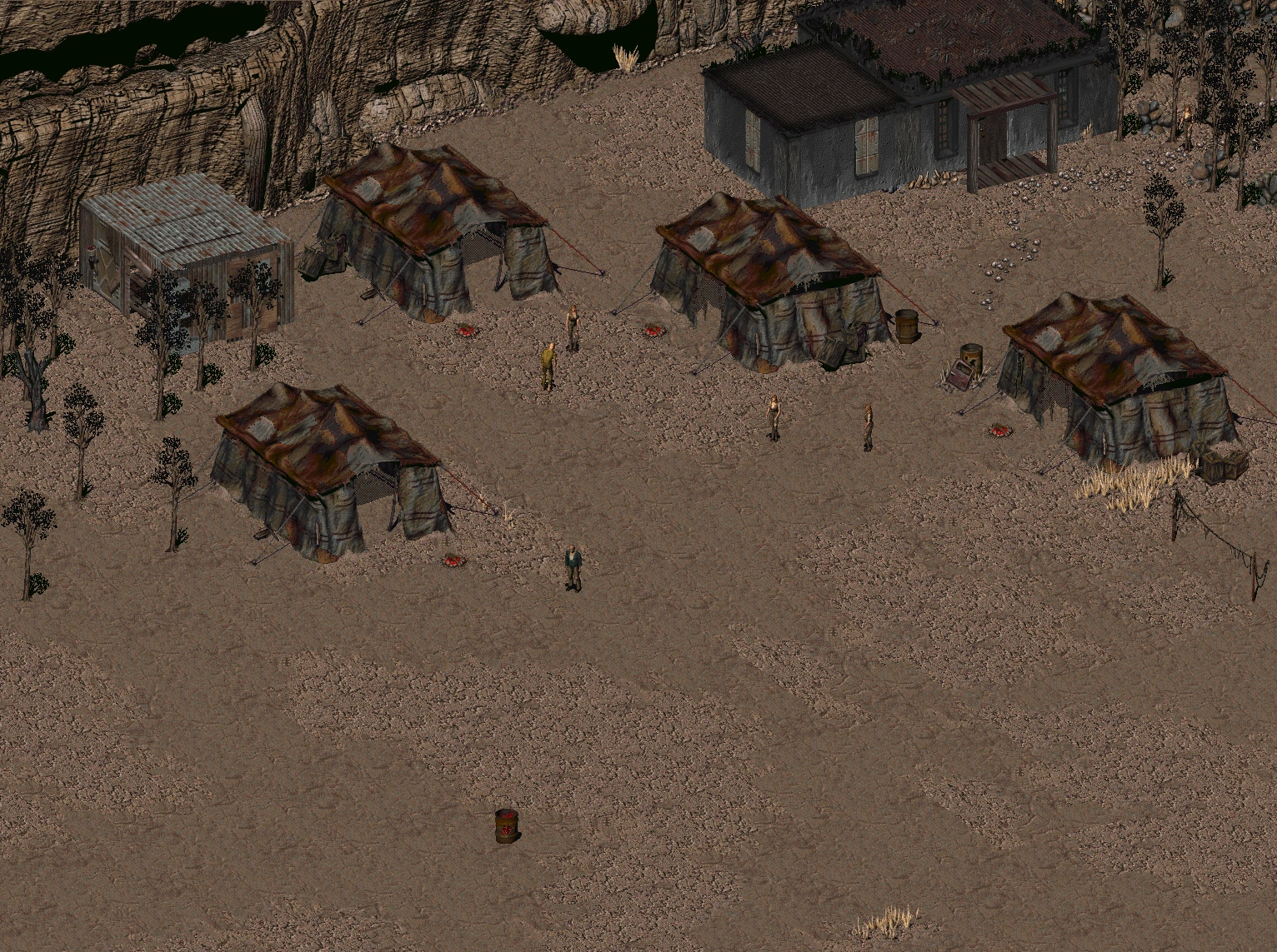 The squat is composed of a small, dilapidated building and several tents. The inhabitants offer the player a cold shoulder until they rescue Chrissy. Then Zeke will reveal the real problem, the Khans in the Vault. The player can convince them to accept NCR authority in exchange for the necessary education and tools.