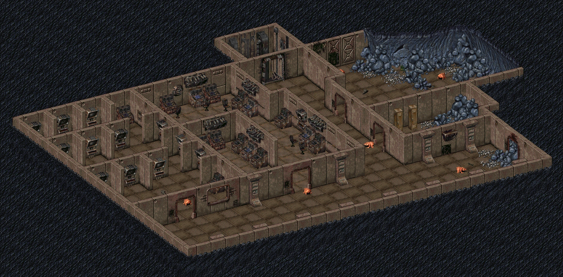 The command center has been excavated, cleared, and repaired. The security and computer center were adapted by Darion as his personal quarters. The storage room holds the computer parts the NCR seeks.