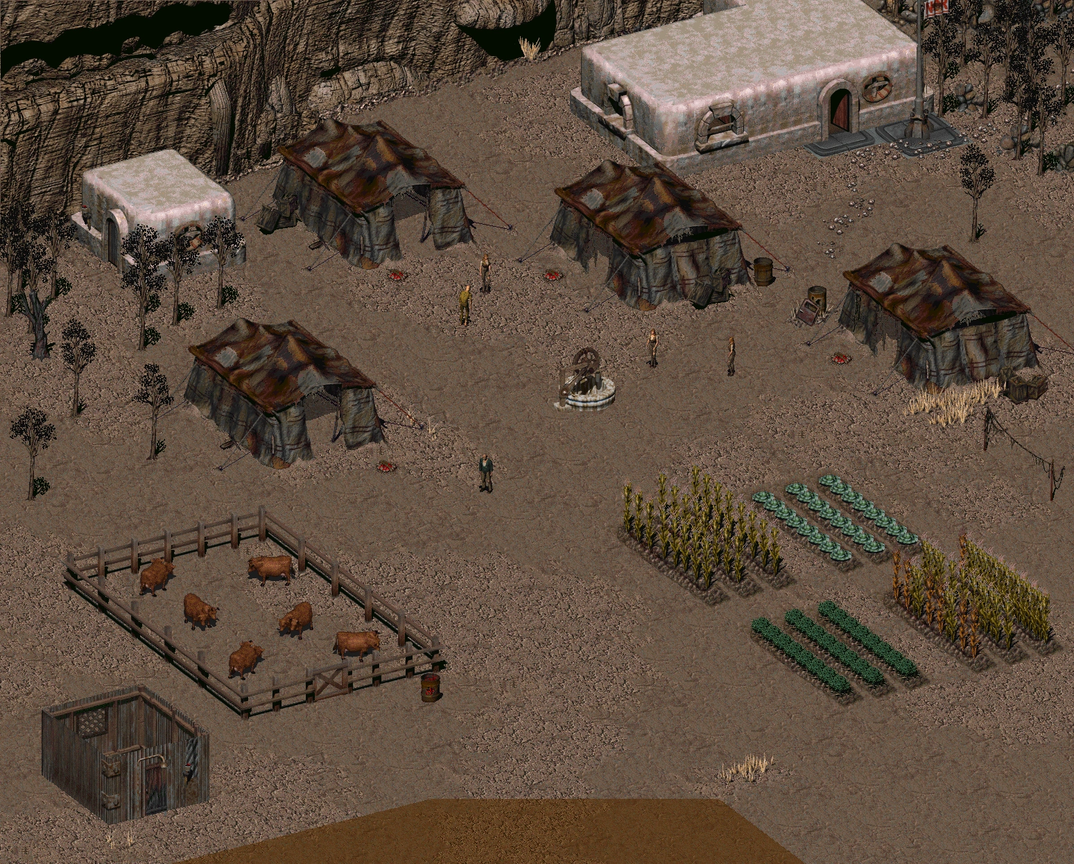The small band, leaderless and stuck in the desert with no food and water, decided to stay at the oasis, at least for a little while. They covered the pit with a tarp and nailed spikes around it to keep whatever horror lived there encased there. They then set up their camp as far from the Pit as possible. Whatever was down in the Pit never bothered them. Days passed. The more influential of the group argued about what they were to do. There was talk of joining up with others from the Vault. There was talk about going back to the Vault." - ↑ The Vault Dweller: "{130}{}{Tell me about yourself.}"