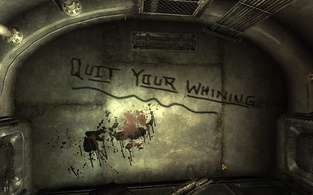 Two of the rooms in the living quarters each have a deceased Fiend on a bed, surrounded by empty syringes, Jet, and Psycho. In the southern section of the living quarters is a bedroom containing a terminal with a user named "Billy boy" and a function called "Compose Automated Blast Message". However, activating the function does nothing, stating that the system is offline.