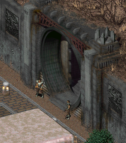 The Courtyard is protected by Vault City's high walls and the heavy laser turrets ringing the perimeter. It is the only area of the City where Outsiders have free access, though it is policed heavily and the actual inhabitants chafe under the strict laws and taxation. Even then, the Outsider farmers are those that provide the city with crops and livestock.