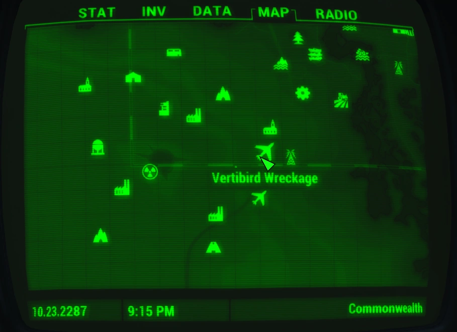 The Vertibird wreckage is a location in the Glowing Sea in the Commonwealth.