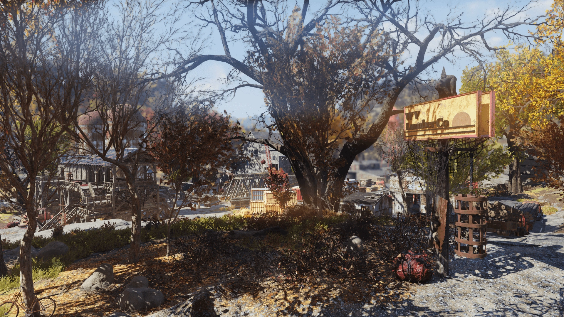 This massive lumber mill stretches alongside the eastern bank of the Ohio and can be roughly divided into three sections. The southeastern one, closest to the entrance road, contains a large warehouse out of corrugated metal and the locations' armor workbench, as well as a chem station and power armor station. It also includes an adjacent mechanic's garage.