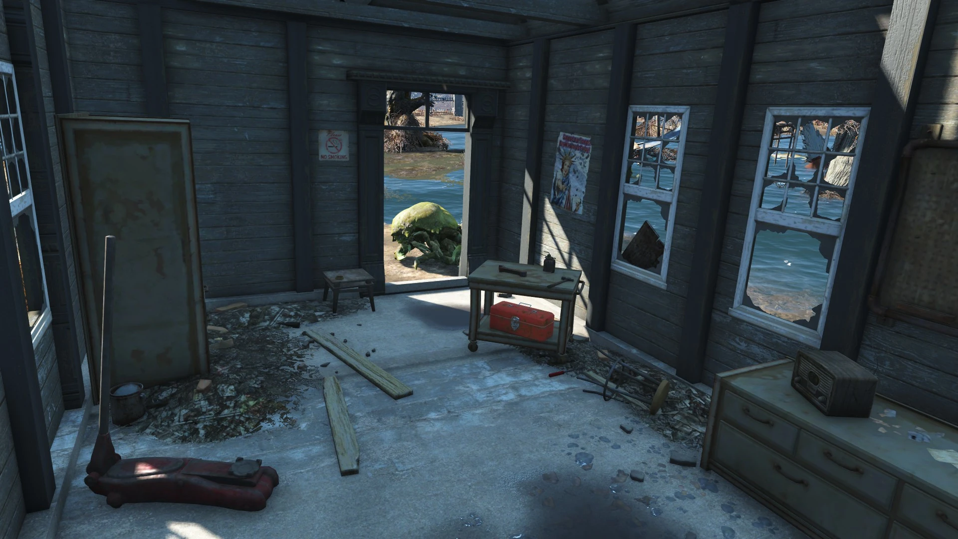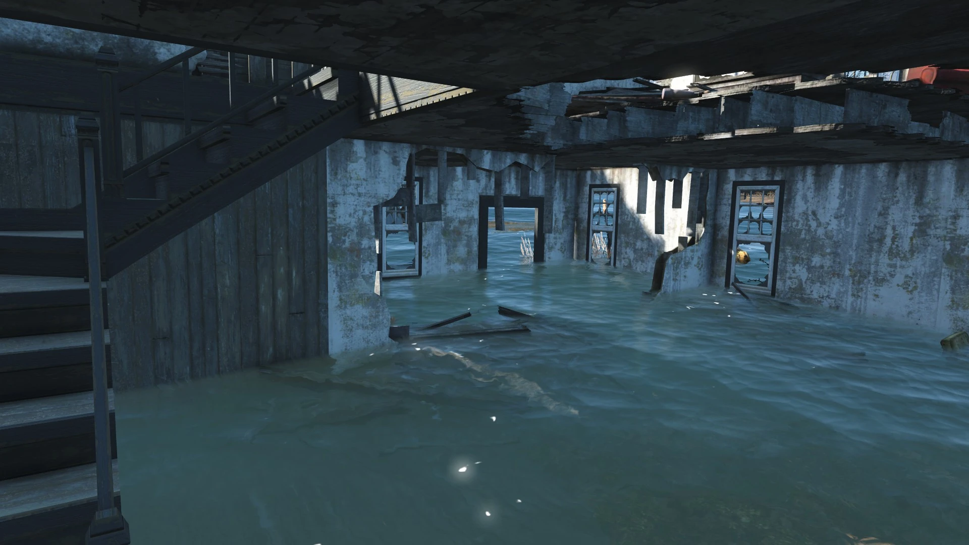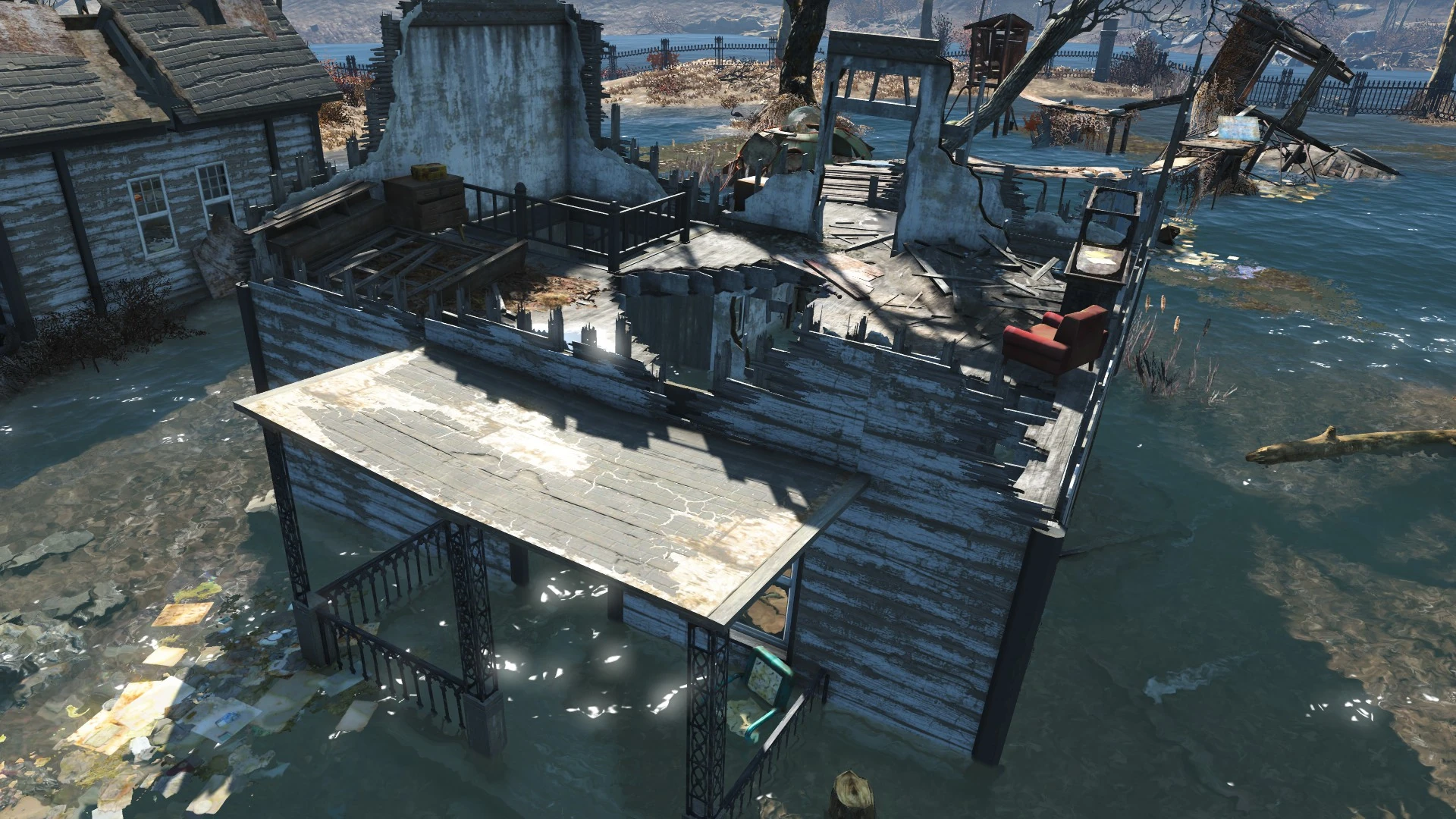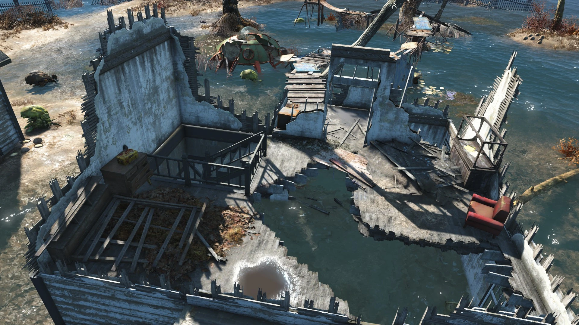 Most of the estate is flooded, except for a shack at the edge of the swamp. The family's house is flooded, with a staircase leading up to the second floor. Makeshift wooden bridges extend from the second floor, over the water to a half sunken platform.