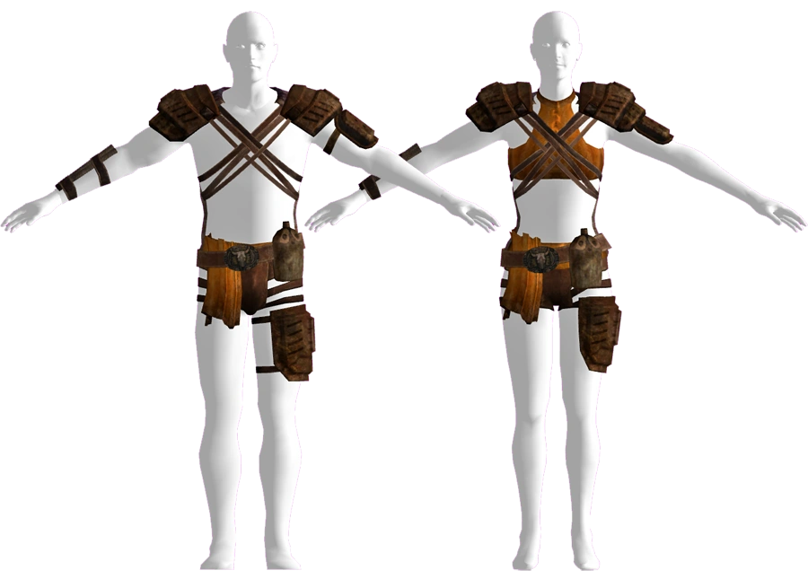White Legs hide armor is a piece of tribal armor worn by members of the White Legs tribe. It provides a Damage Threshold of 7. Its shoulder pads, thigh guard, and belt appear to come from NCR Ranger patrol armor, indicating that the White Legs have encountered NCR Rangers.
